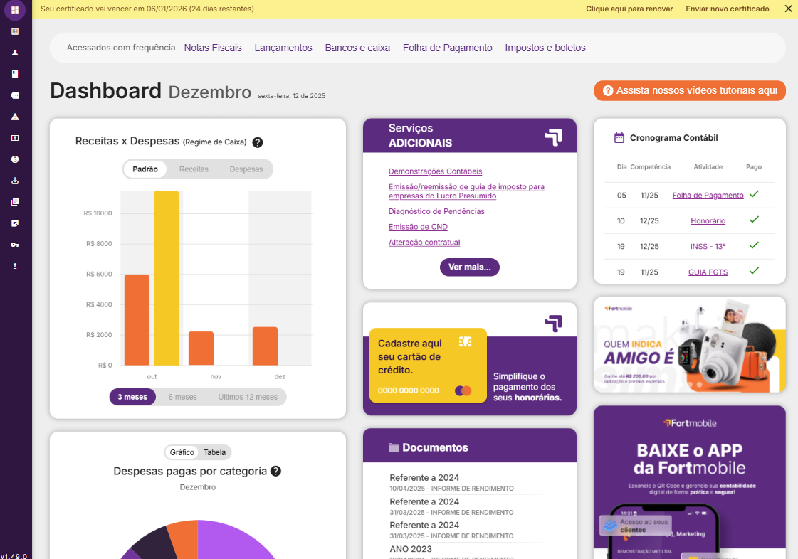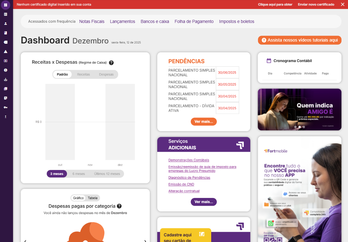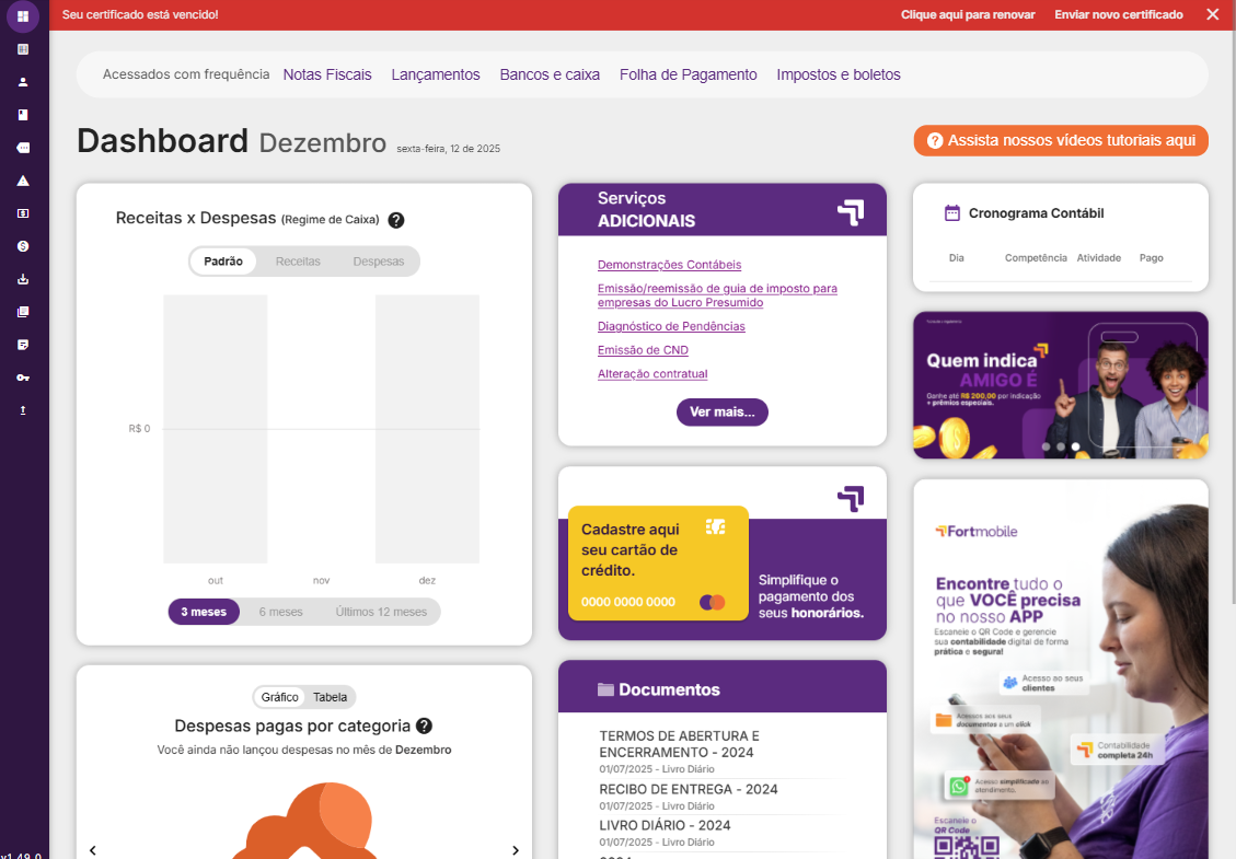 Se houver qualquer aviso em vermelho relacionado ao certificado digital, a ação necessária deve ser tomada de forma imediata.